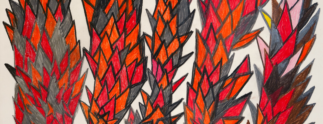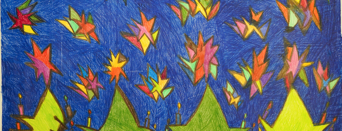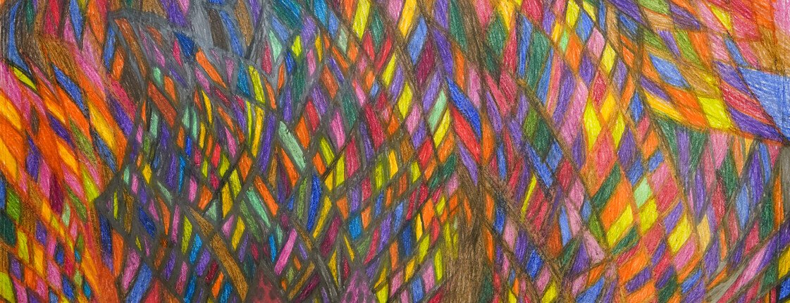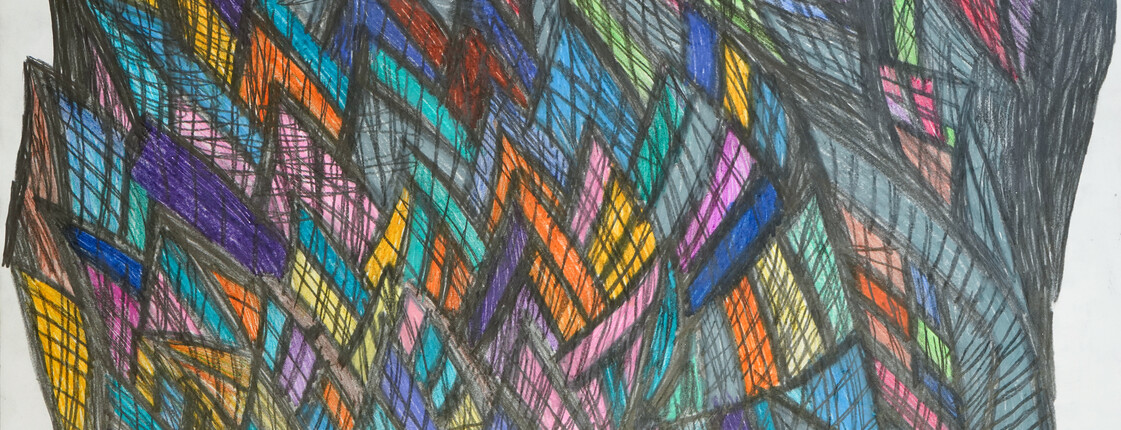 Mayers farbintensive Zeichnungen setzen sich aus vielen, dicht aneinander gegliederten Einzelteilen zusammen und verschmelzen zu einer großen Einheit. In ihrer Gesamtheit lassen die Teilchen oft eine Gruppe von Figuren oder Blumen erkennen, die sich in der Masse sofort wieder auflösen können. Oftmals tauchen vereinzelte Motive wie Häuser, Tannenbäume oder Sterne auf. Karin Mayer arbeitet ausgesprochen ausdauernd an klein- und großformatigen Blättern. Sie verwendet ausschließlich Bunt- und Bleistifte. Mit der stark deckenden schwarzgrauen Kontur der einzelnen Teilchen erinnern ihre Zeichnungen immer wieder an Ausschnitte eines Mosaikfensters. Durch die unterschiedlichen Größen der einzelnen Teilchen, die sehr konzentriert an einer bestimmten Stelle in der Masse platziert werden, gewinnen ihre Zeichnungen an Tiefe und sogar Bewegung – eine Gruppe von Schüler*innen auf ihrem Schulweg oder ein Wind, der über die Blumenfelder weht.