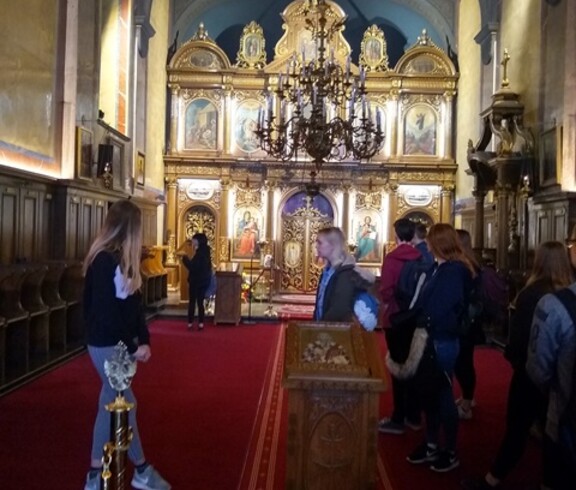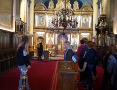 Auf dem Weg von der Bahnstation Rennweg zur Kirche passierten wir die russisch-orthodoxe Kirche in der Jaurésgasse und konnten uns mit der orthodoxen Architektur mit den goldenen Kuppeln und anderen Zierelementen vertraut machen. Die serbisch-orthodoxe Kirche slbst ist von außen eher unscheinbar und in die ortsübliche Fassadenwand integriert, punktet aber innen mit einer beeindruckenden Ikonostase. Wir erfuhren viel Praktisches über das orthodoxe Glaubensleben und wer wollte, konnte eine Kerze nach orthodoxem Ritus entzünden.