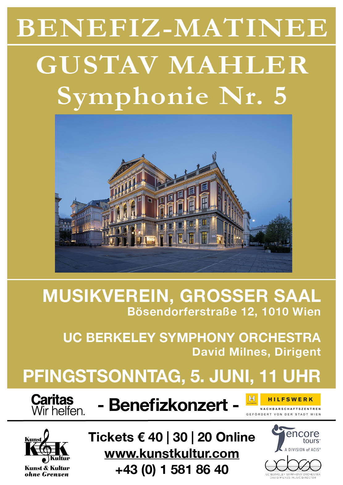 Gerne laden wir Sie ein, das Benefizkonzert am Pfingstsonntag mit dem UC Berkeley Symphony Orchestra im Wiener Musikverein zu besuchen. Am Programm steht Gustav Mahlers Symphonie No. 5. Der Reinerlös ergeht an das Caritas Hospiz sowie an Hilfswerk Nachbarschaftszentren.