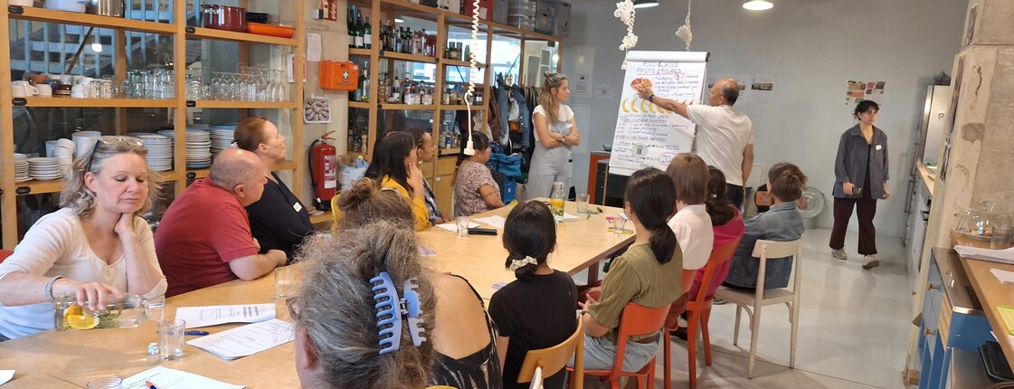 Die dreistündigen Kochworkshops von „ToNoWaste“ finden seit Anfang Mai 2024 in der Gemeinschaftsküche von Community Cooking im Erdgeschoß des Kulturhaus Brotfabrik statt. Sie werden in mehreren Sprachen, wie z.B. Deutsch, Englisch, Arabisch und Ukrainisch, angeboten und richten sich an alle Interessierten. Wir verwenden viele Visualisierungen und nehmen uns ausreichend Zeit für Fragen und Austausch. Die Teilnehmenden haben zudem die Möglichkeit, ihre eigenen Methoden und Tipps gegen Lebensmittelverschwendung mit der Gruppe zu teilen und zu diskutieren.