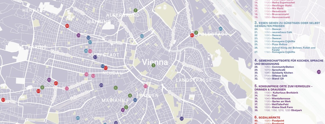 Der kulinarische Stadtplan zeigt wichtige Orte rund ums Essen in Wien, von leistbaren, nachhaltigen und kulturell vielfältigen Einkaufs- und Essmöglichkeiten bis hin zu Treffpunkten für gemeinsames Kochen, Sprache und Begegnung.
